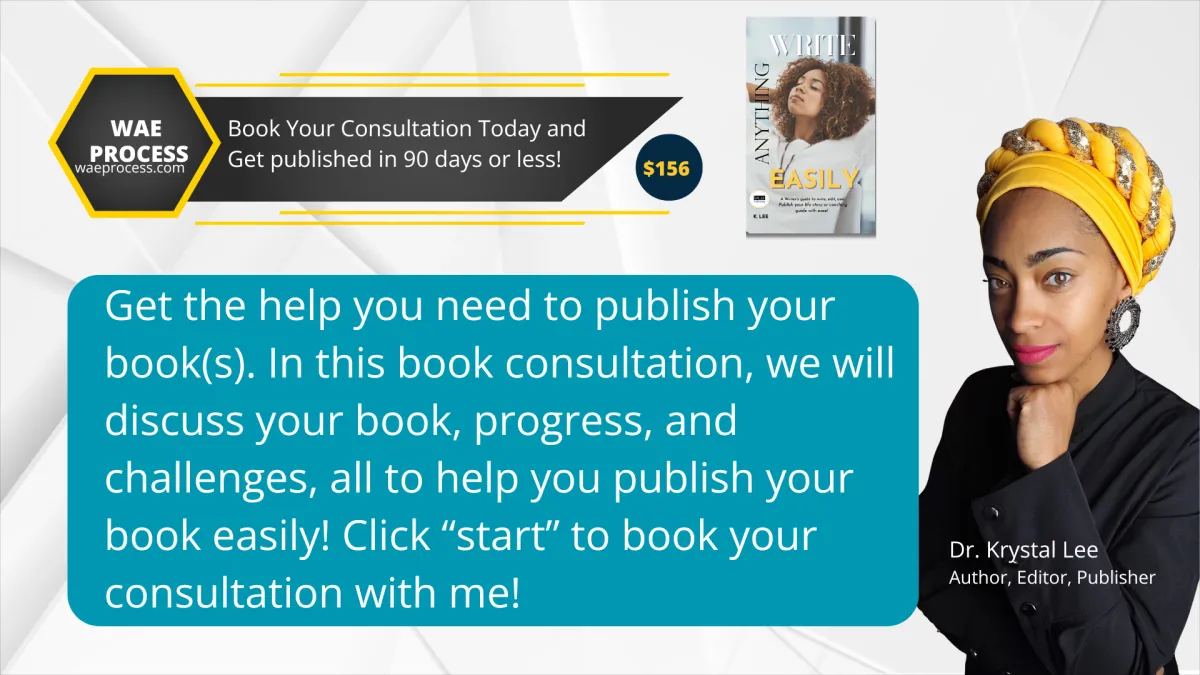 If you want to have my help for each step of the process, or to learn what you need and book 1 or 2 sessions, don't miss signing up for coaching with Dr. Krystal Lee, published author K Lee, of nearly 75 books.